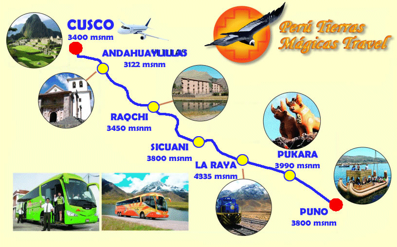 Durante el viaje tendremos nuestro tours en la ruta Cusco Puno cusco visita la sugunda calipilla sixitna de sud america andahuaylilla y tempodel sol weracucha y el meseo de pucara tiempo de viaje 10 horas incluye servicio a bordo almuerzo buffet , califacccion y terra mosa, oxigino de primeros auxillos .